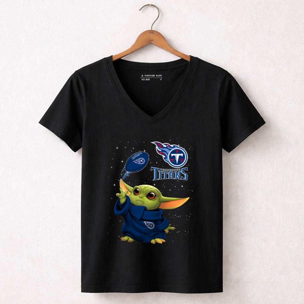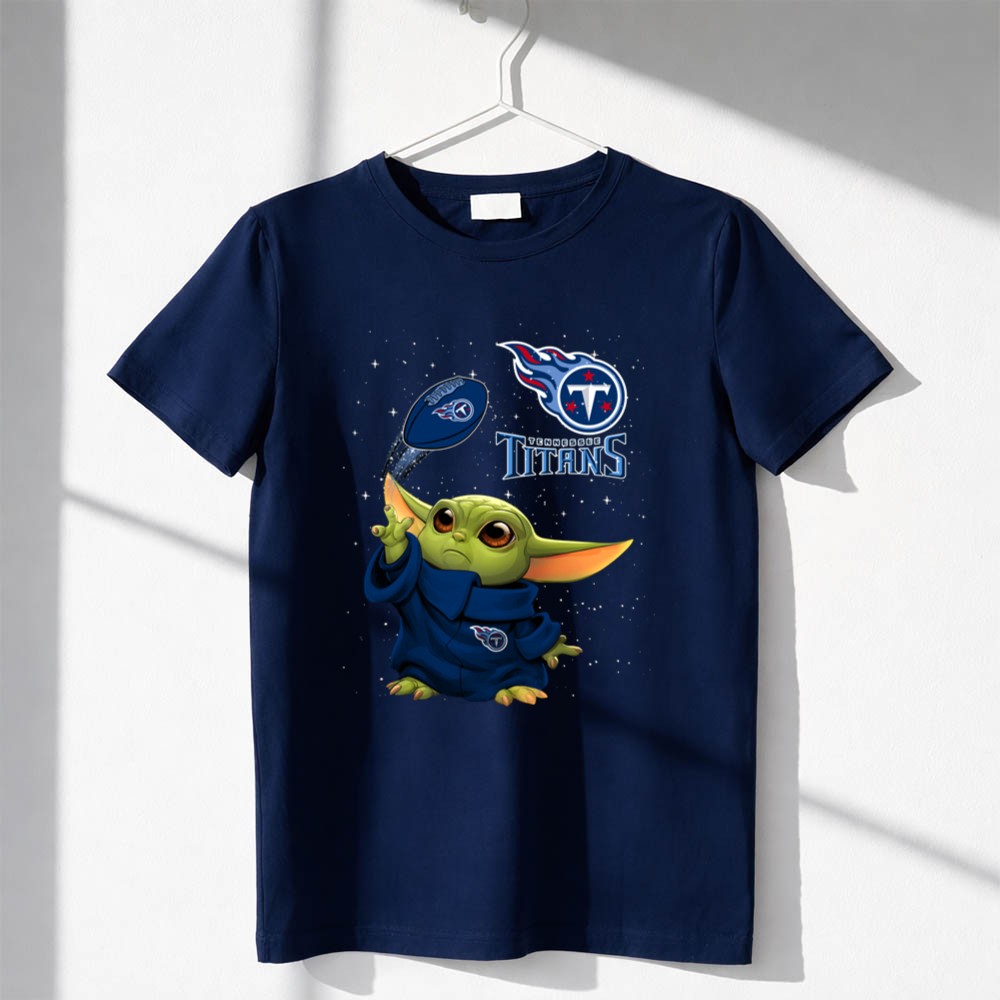 This playful design features the adorable Baby Yoda, dressed in Tennessee Titans gear, joyfully tossing a Titans cap. It captures the spirit of fandom, merging the whimsical world of Star Wars with the excitement of NFL culture. Ideal for sparking joy and pride in every young Titans supporter, this shirt celebrates a unique blend of beloved characters and team loyalty.