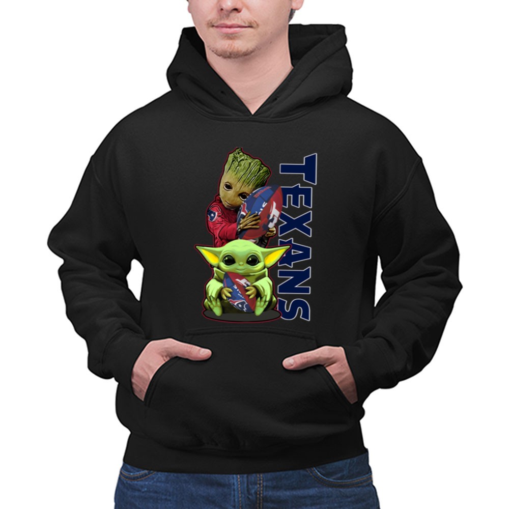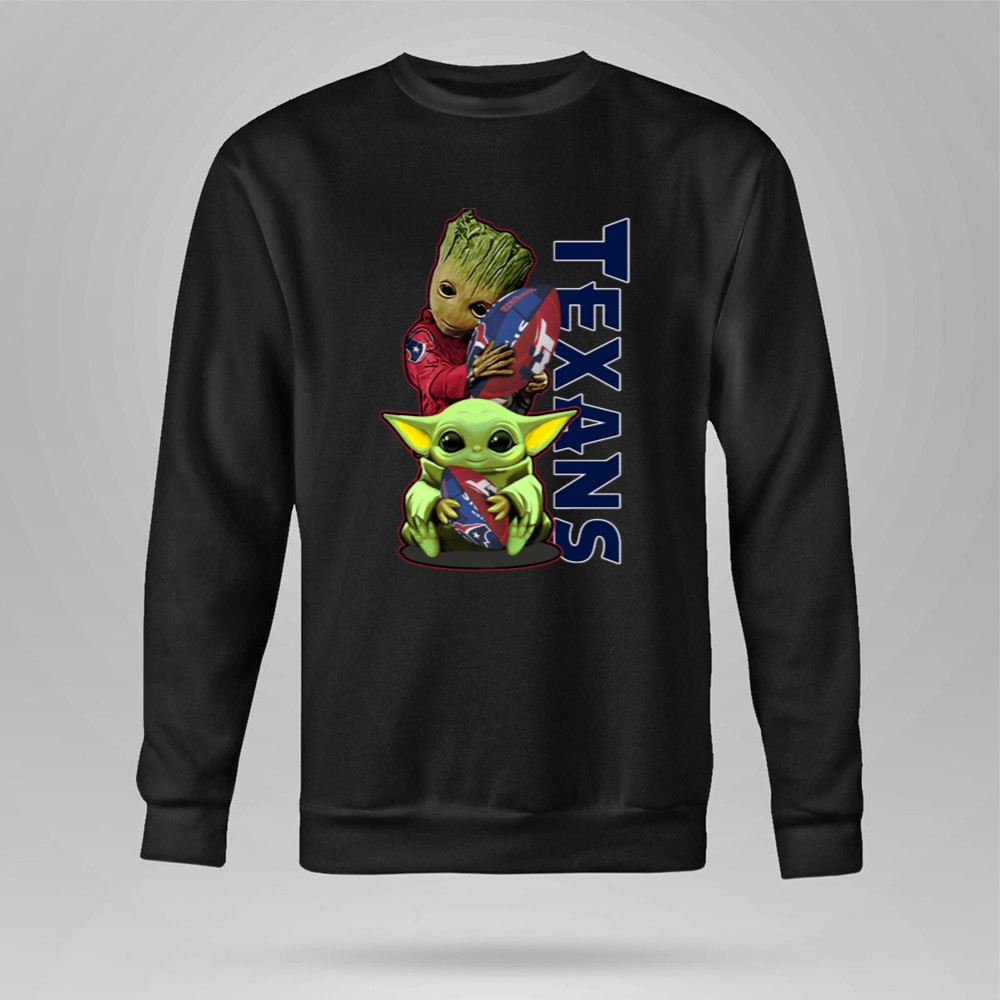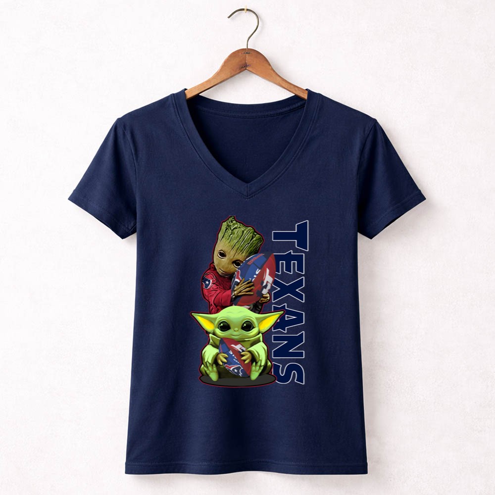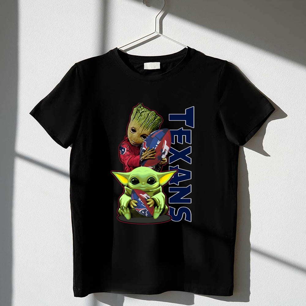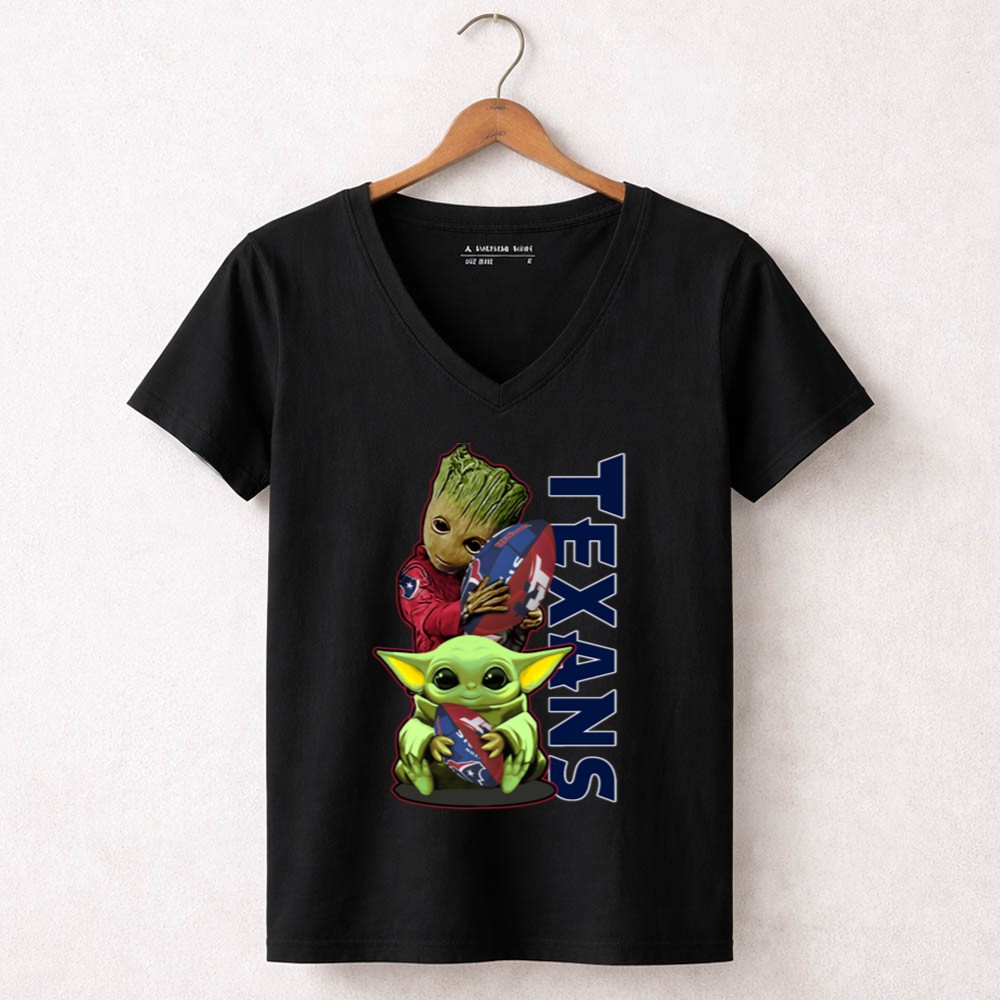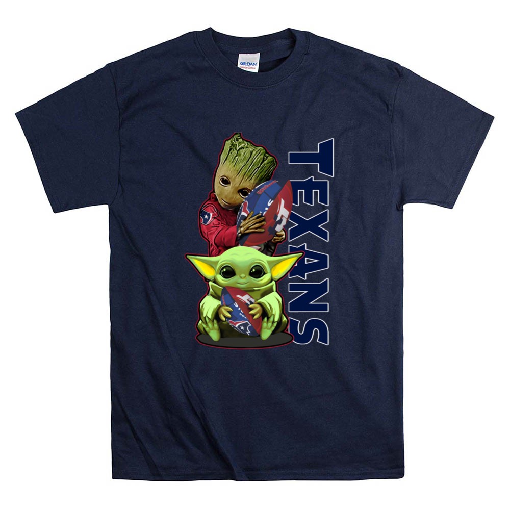 Houston Texans pride, NFL baby gear, Groot and Baby Yoda, Houston sports culture, playful fan apparel, premium soft cotton t-shirt, game day cuteness, youth NFL merchandise