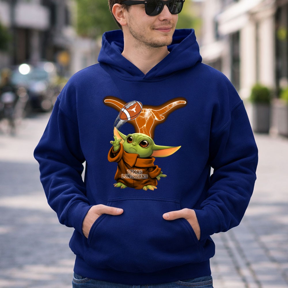 Embrace your Texas Longhorns spirit with Baby Yoda in this playful football-themed design.