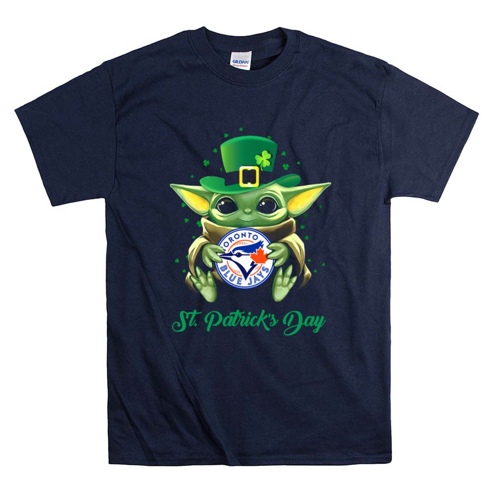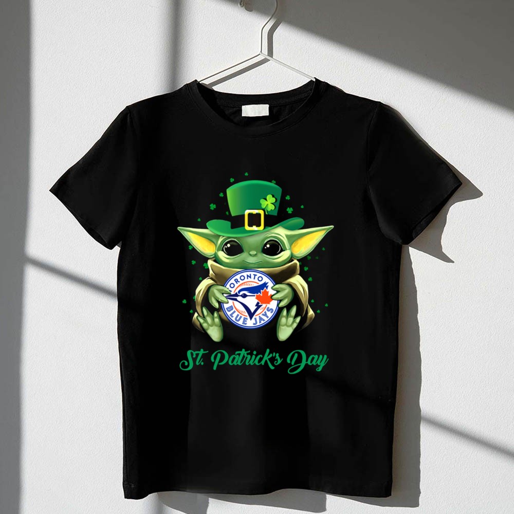 Toronto Blue Jays fan gear, Baby Yoda merchandise, St. Patrick's Day apparel, Major League Baseball pride, lucky charm design, Toronto sports culture, vibrant holiday t-shirt, baseball and pop culture fusion