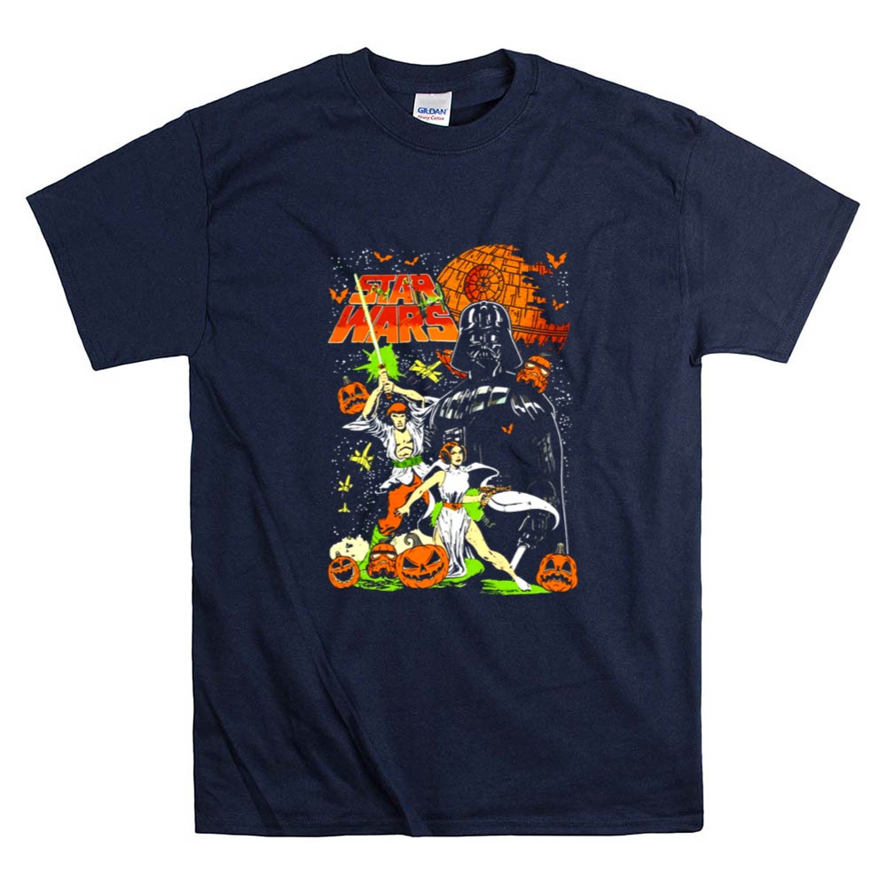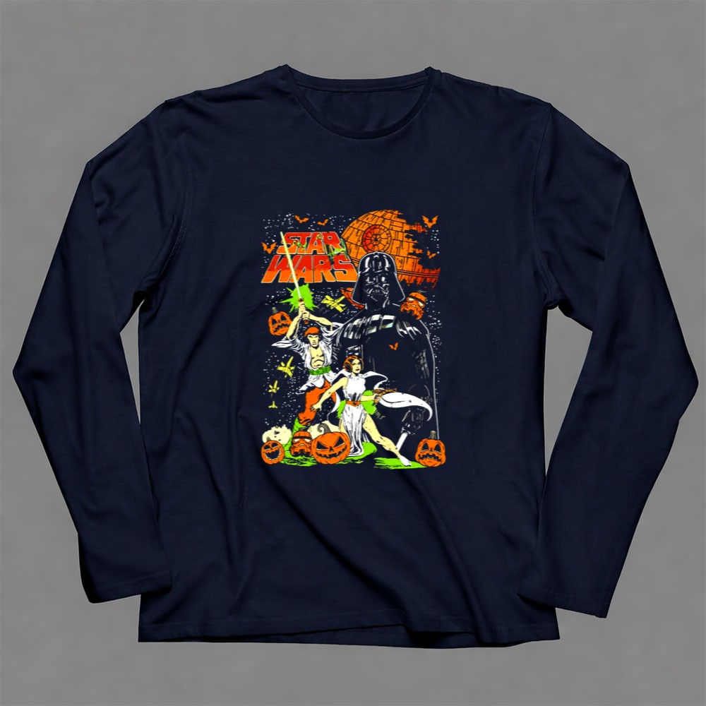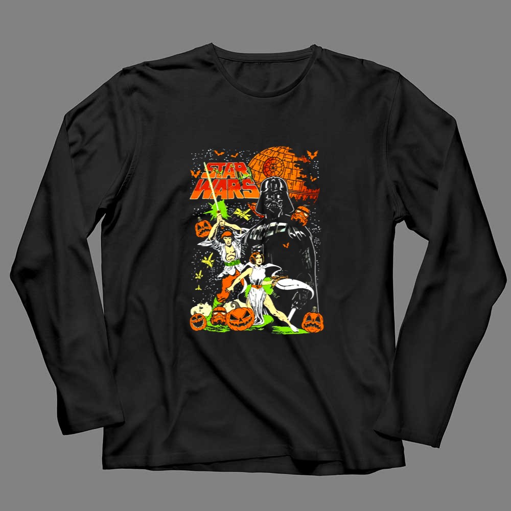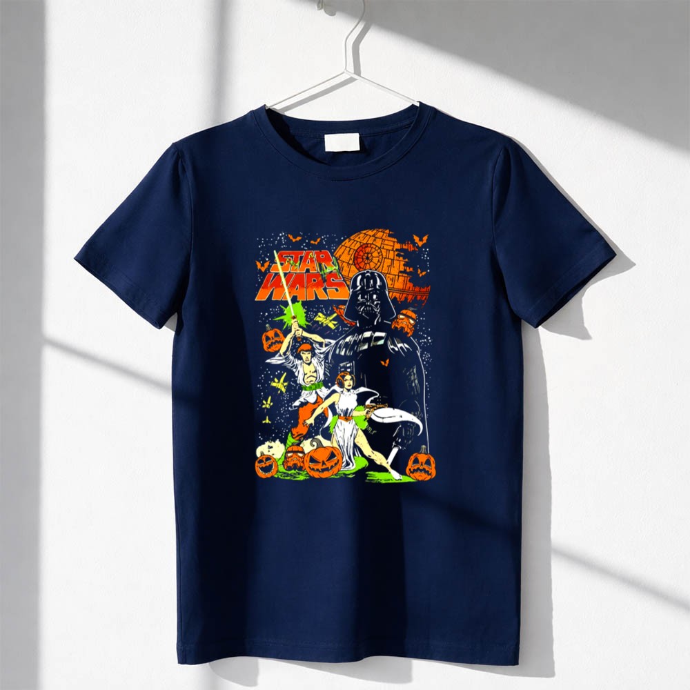 This design captures the whimsical essence of Halloween by bringing together Darth Vader, Princess Leia, and Han Solo in a colorful, vintage comic art style. Nestled among cheerful pumpkins, these iconic characters evoke a sense of joy and nostalgia, making it a perfect tribute for fans who cherish the magic of both Halloween and the Star Wars universe.