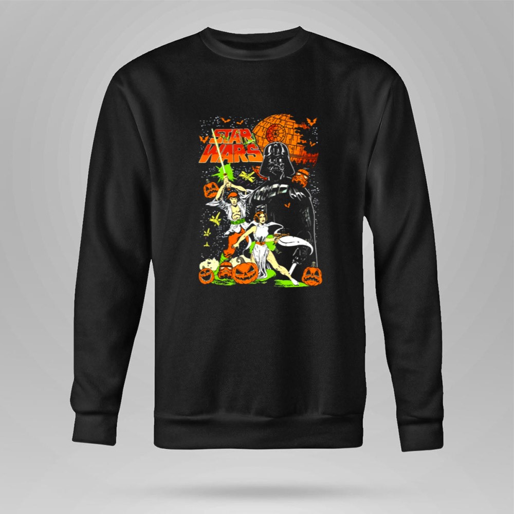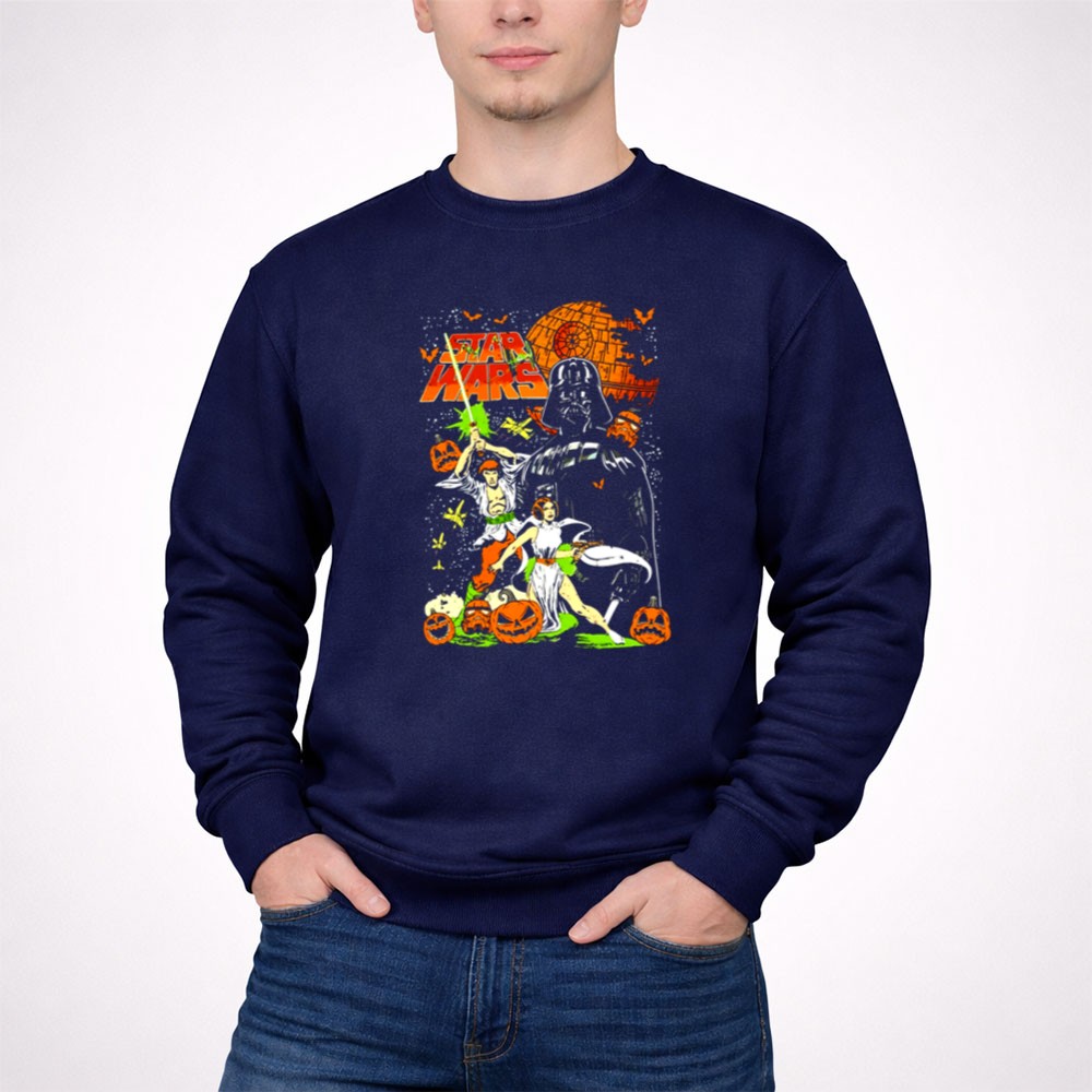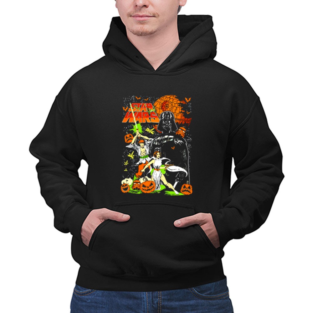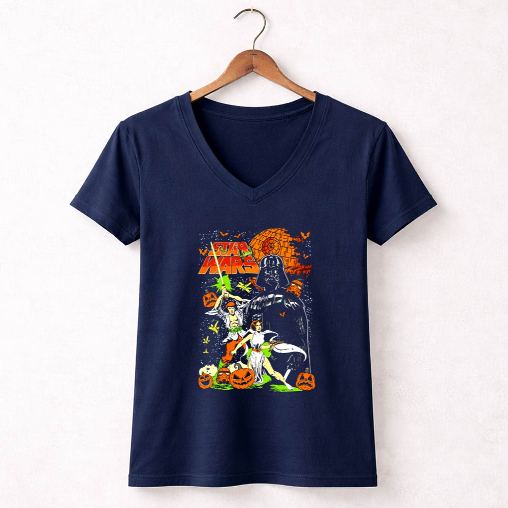This design captures the whimsical essence of Halloween by bringing together Darth Vader, Princess Leia, and Han Solo in a colorful, vintage comic art style. Nestled among cheerful pumpkins, these iconic characters evoke a sense of joy and nostalgia, making it a perfect tribute for fans who cherish the magic of both Halloween and the Star Wars universe.