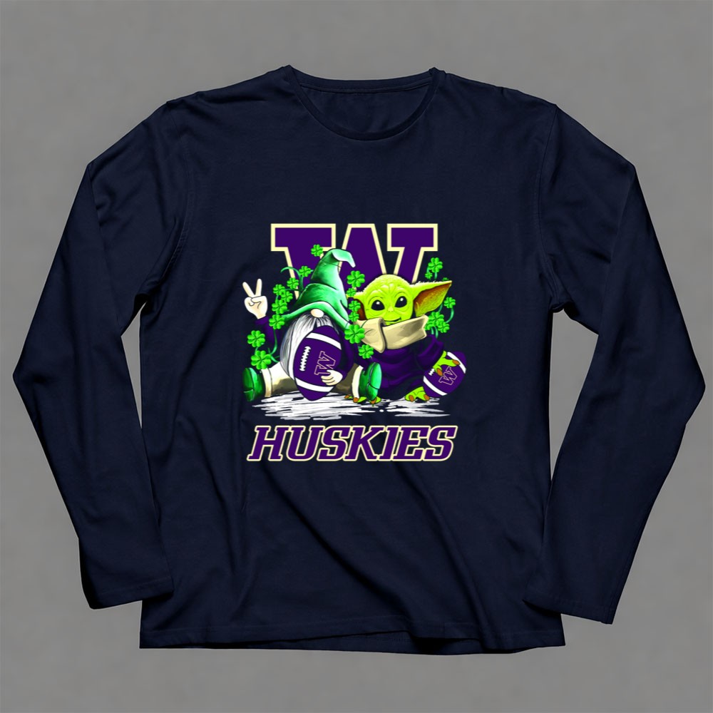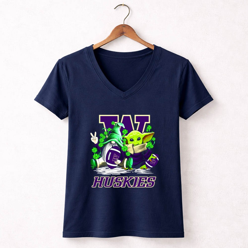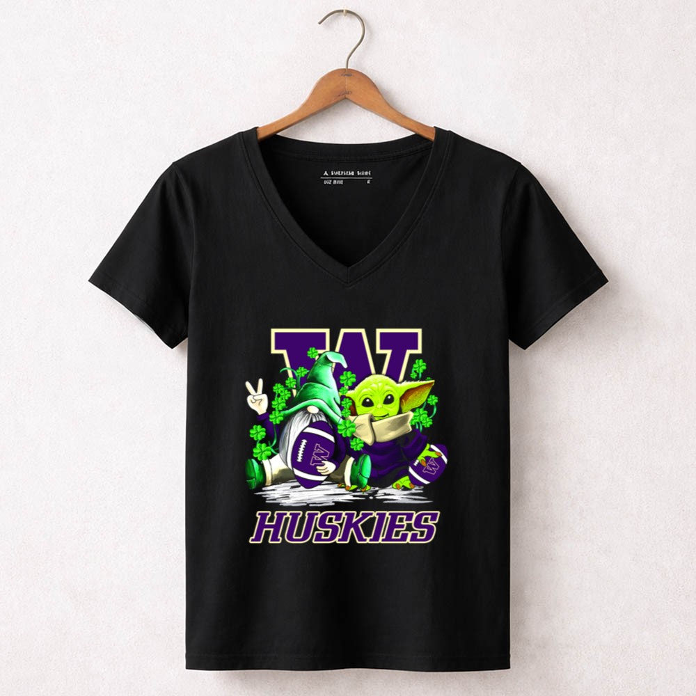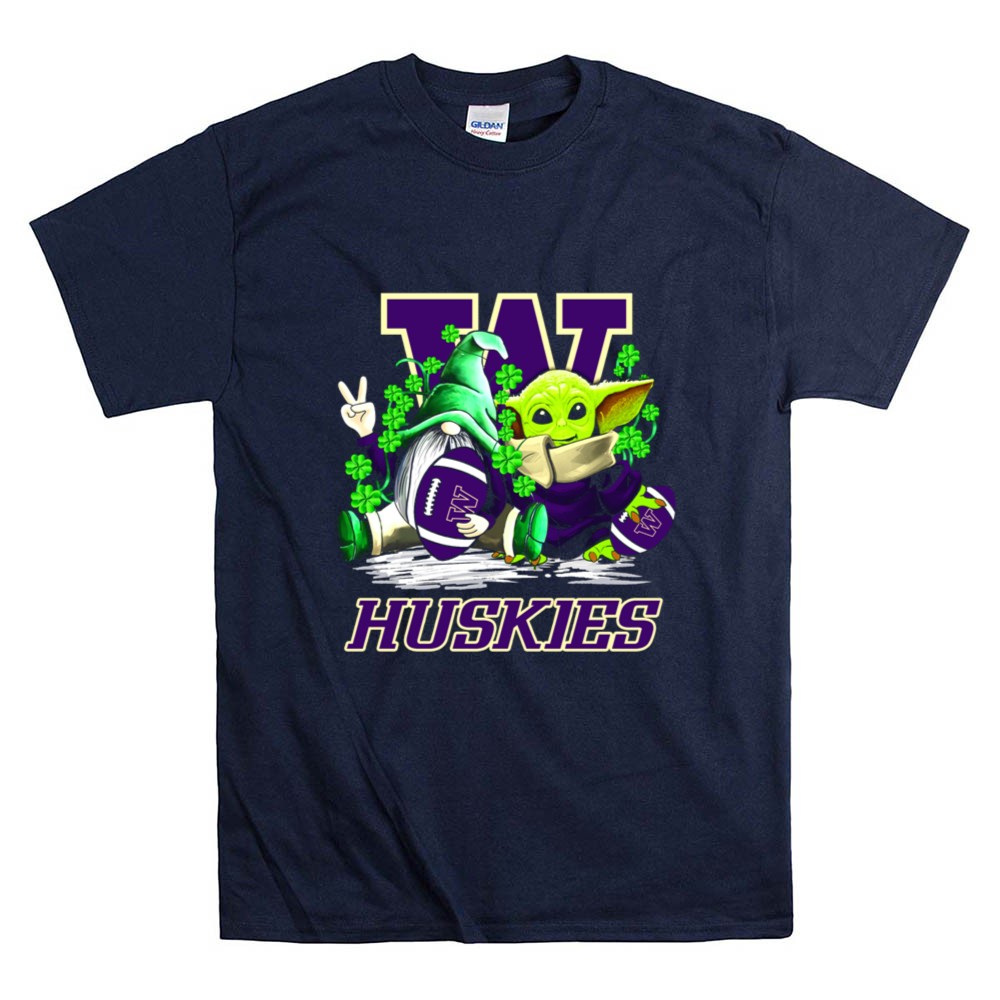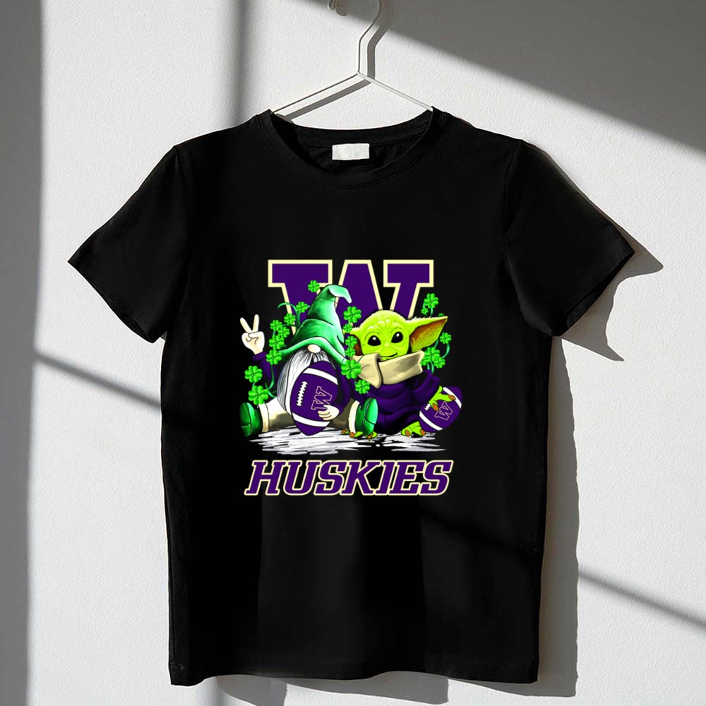 Washington Huskies football, St. Patrick's Day apparel, college football fan gear, whimsical sports t-shirt, Baby Yoda merchandise, gnome collectibles, shamrock designs, game day outfit
