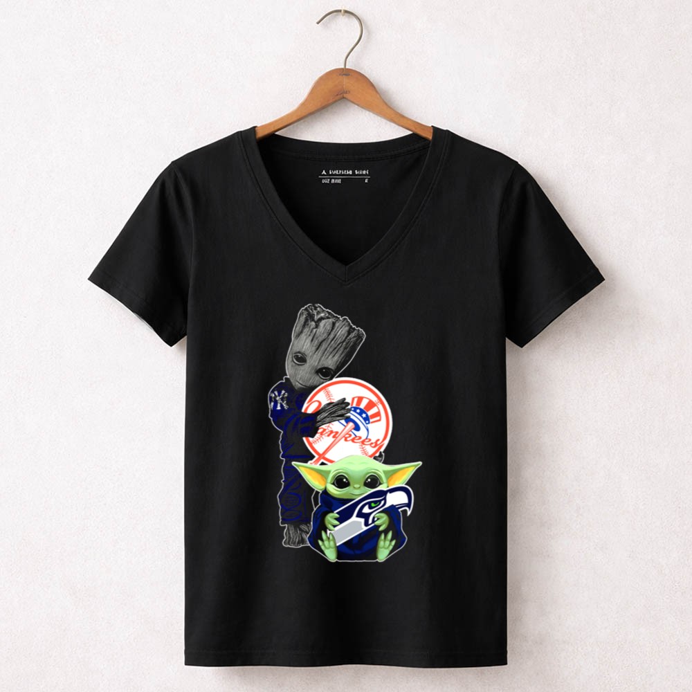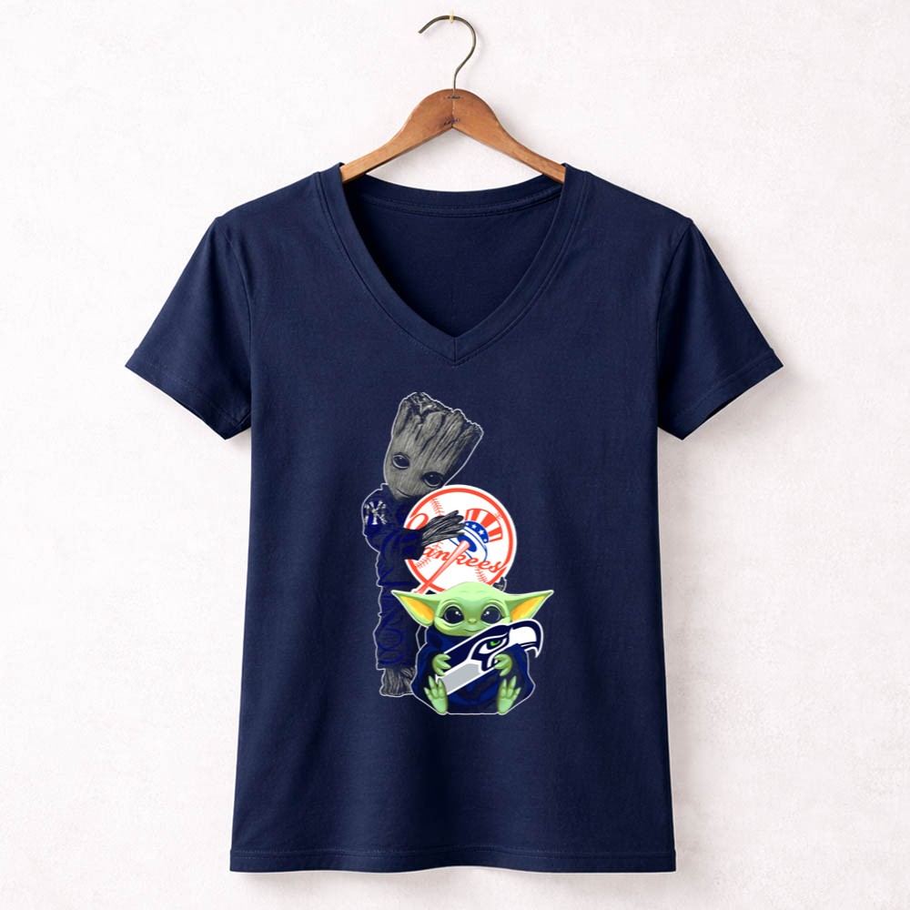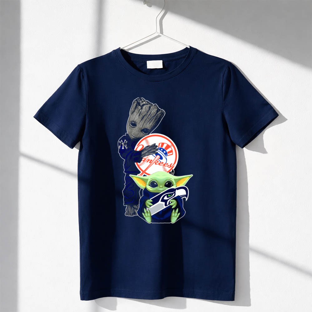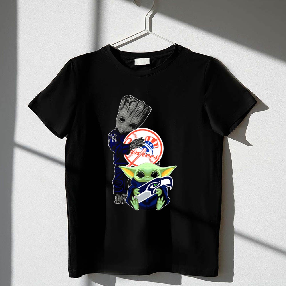 New York Yankees, Seattle Seahawks, Baby Yoda, Groot, intergalactic fandom, pop culture sports tee, playful sports apparel, game day fun