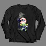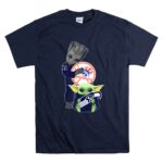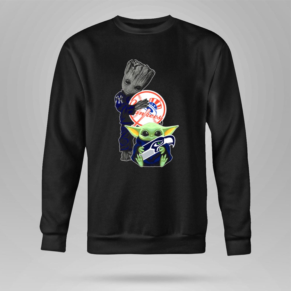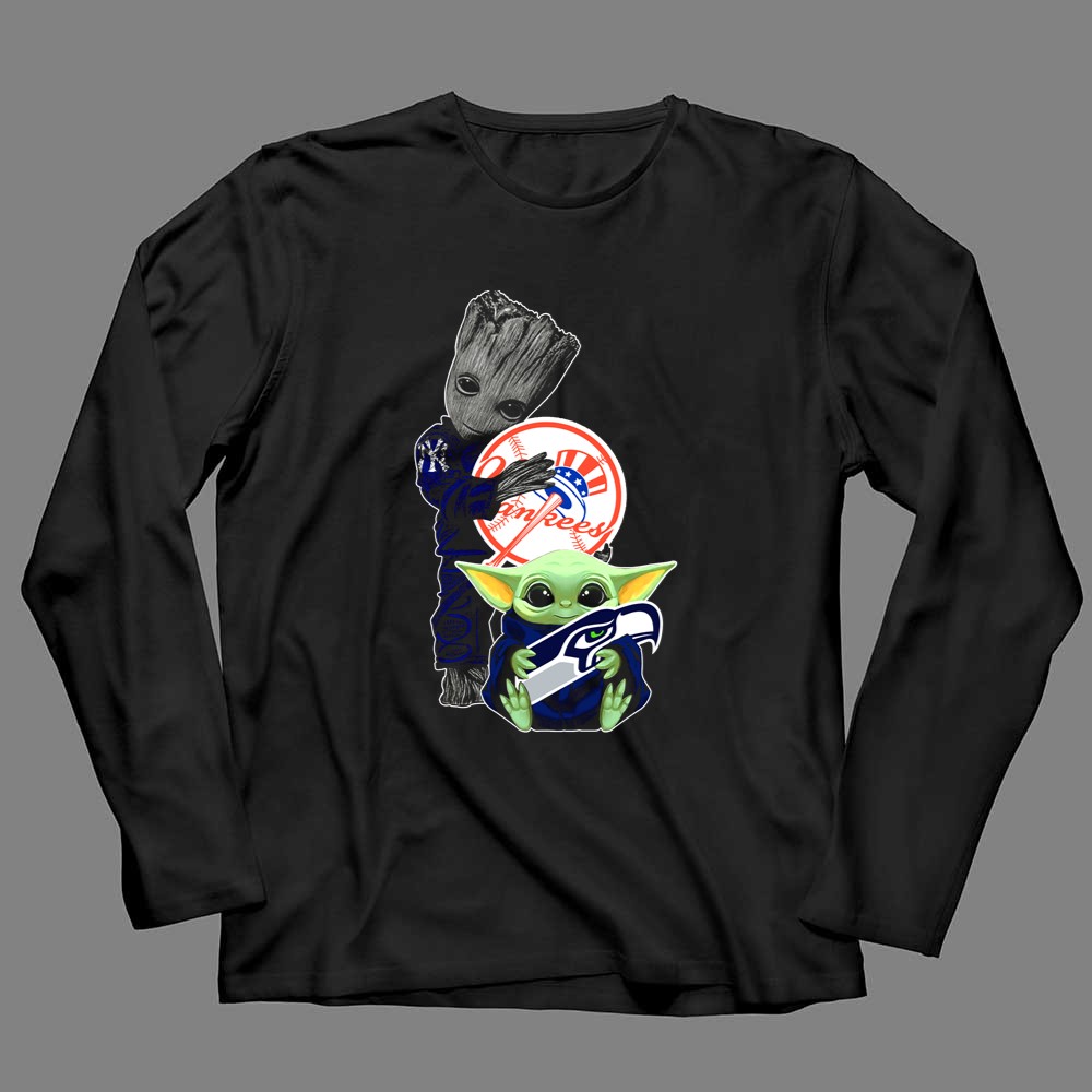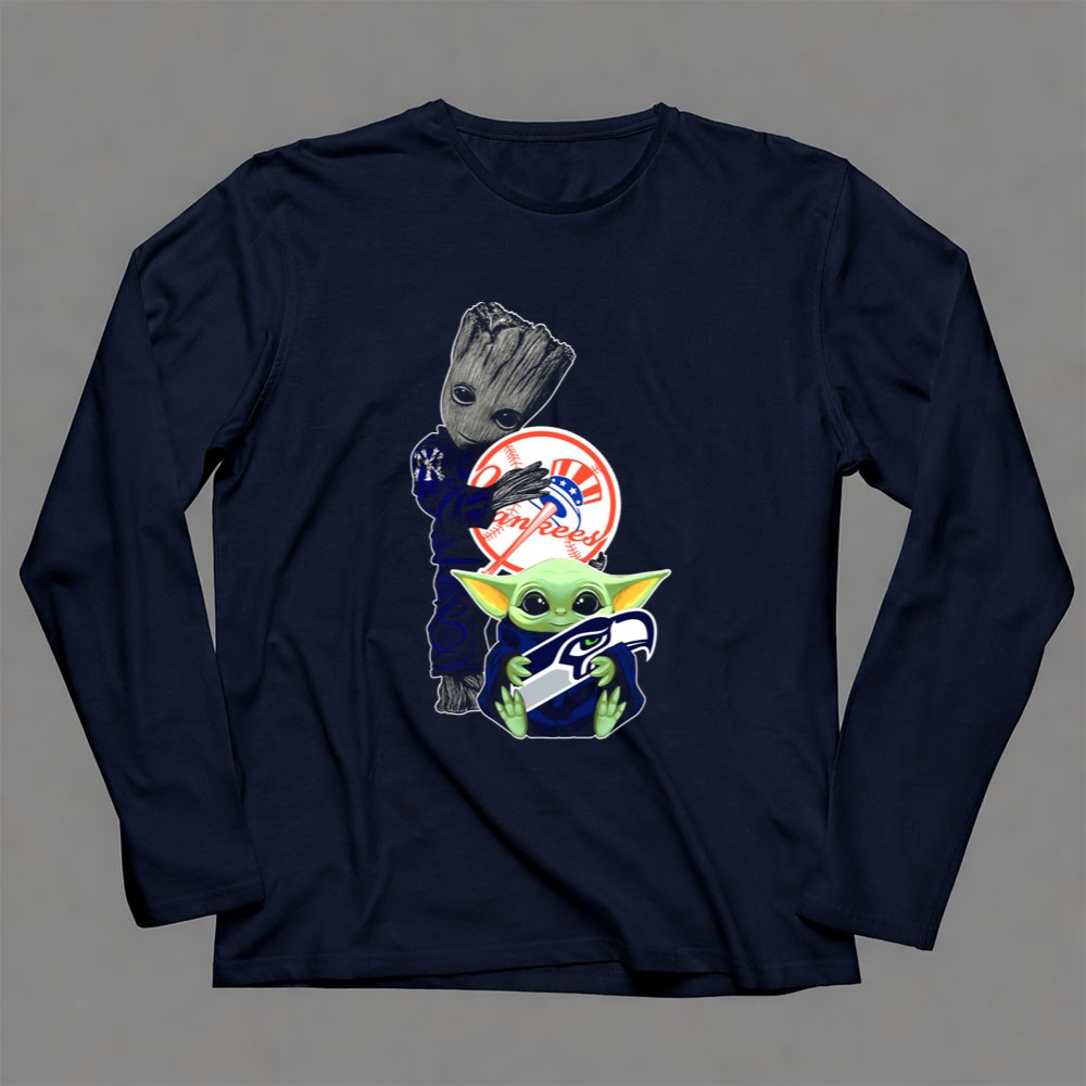 New York Yankees, Seattle Seahawks, Baby Yoda, Groot, intergalactic fandom, pop culture sports tee, playful sports apparel, game day fun
