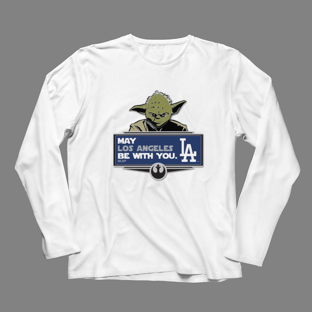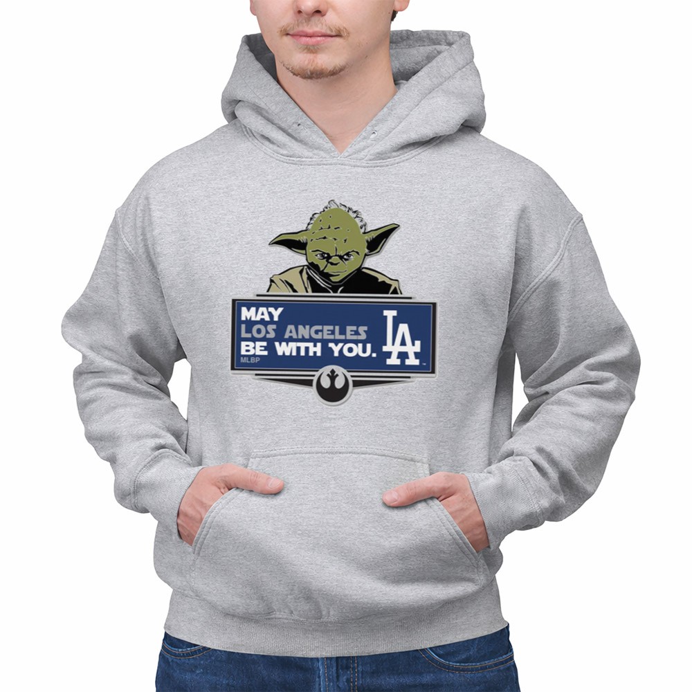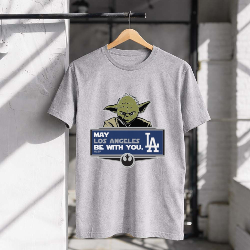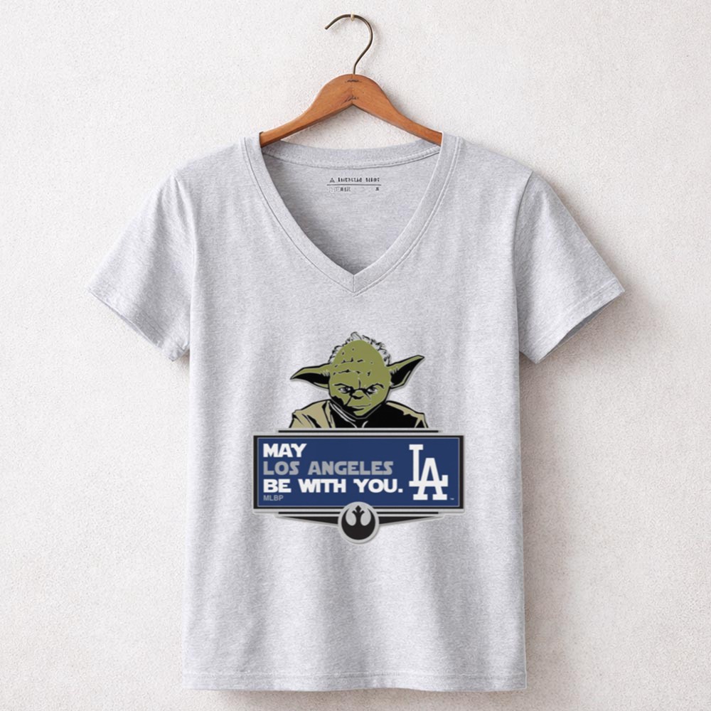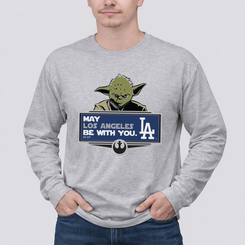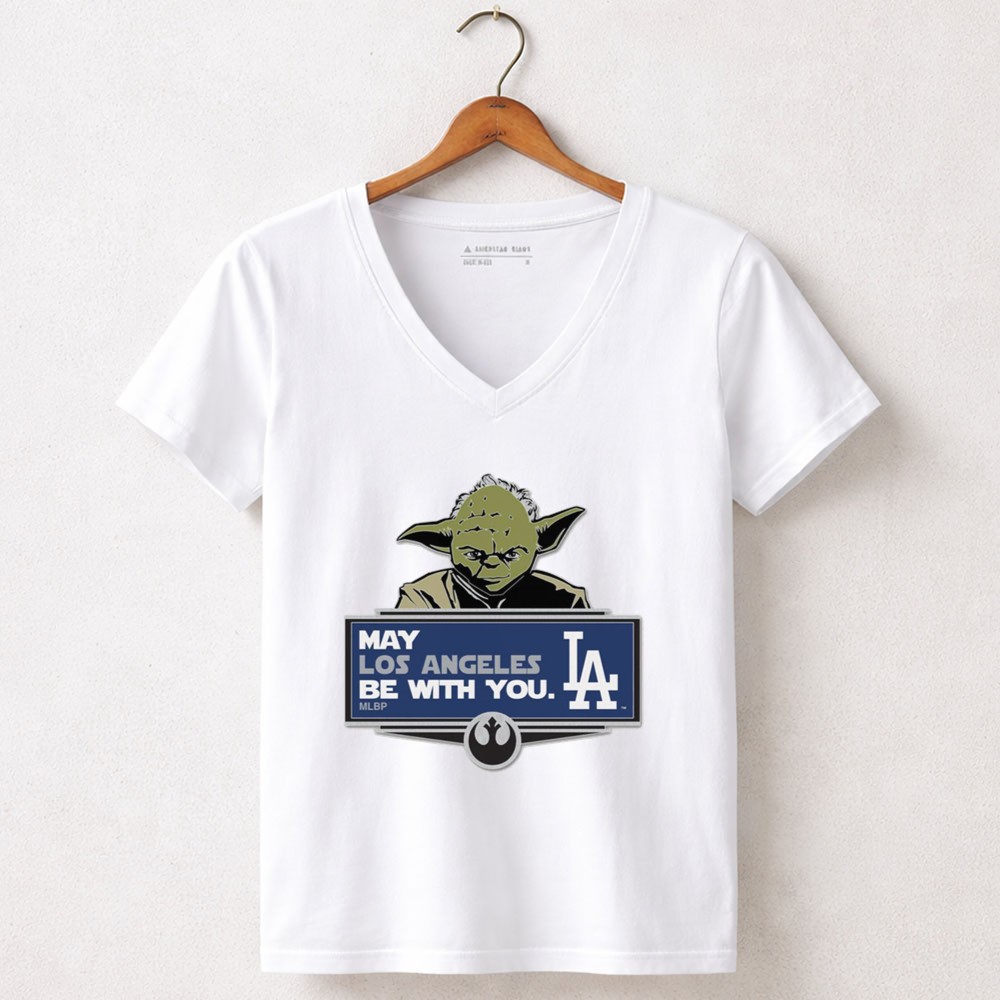 This design captures the magic of two beloved worlds: the Los Angeles Dodgers and the Star Wars universe. Inspired by Yoda’s wisdom, the phrase ‘May Los Angeles Be With You’ serves as a playful reminder of the camaraderie and excitement that sports bring to our lives. It’s a minimalist yet striking tribute that resonates with fans who cherish both the thrill of the game and the epic tales of adventure.