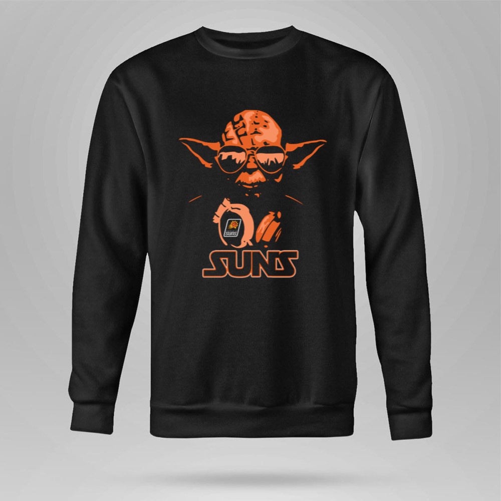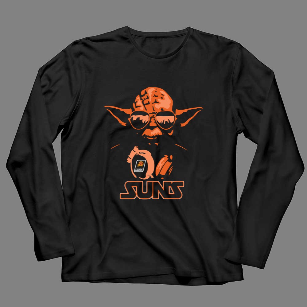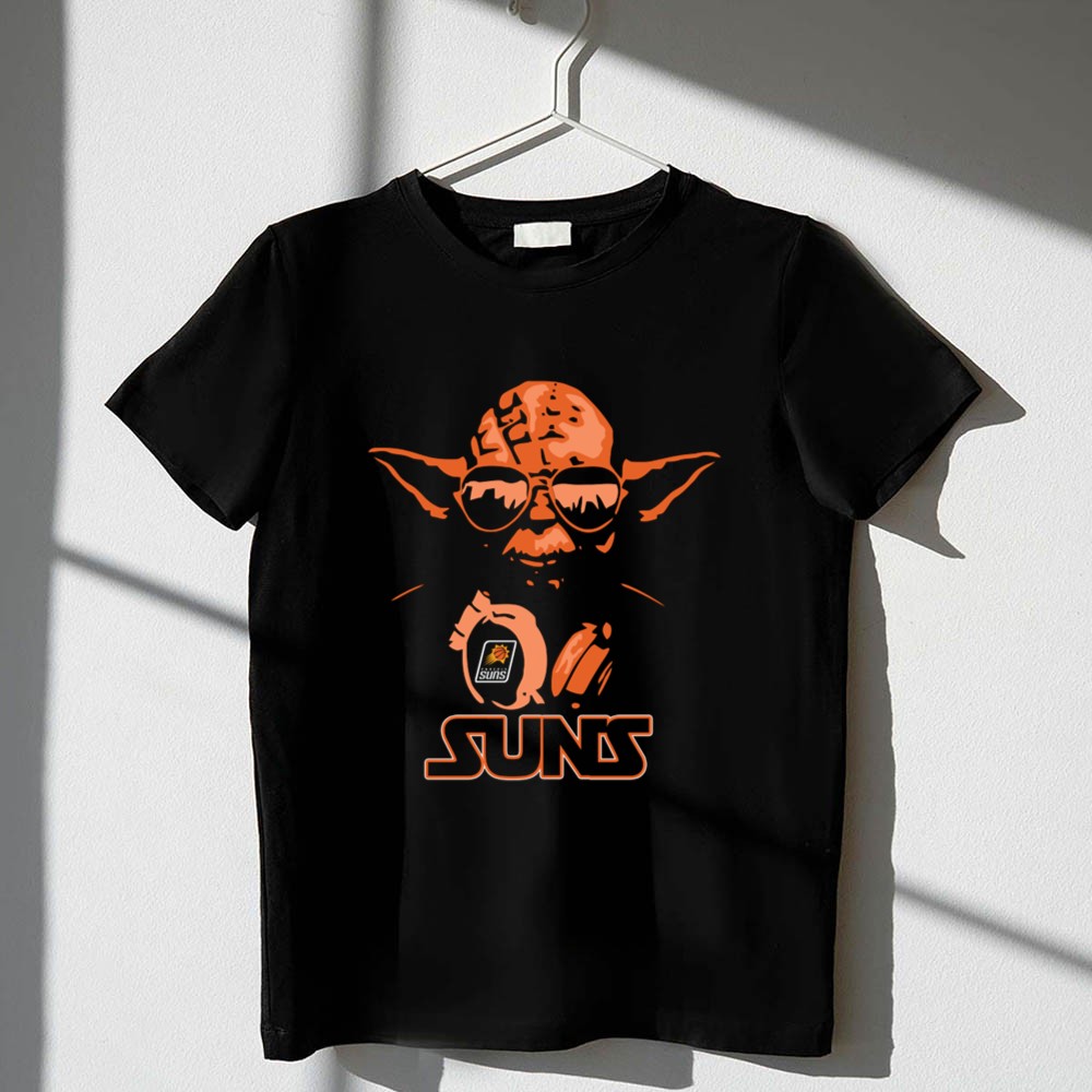 This unique design features Yoda, the wise Jedi Master, donning sunglasses and headphones, proudly holding the Phoenix Suns logo. It encapsulates the joy of blending two beloved worlds, showcasing a playful tribute that resonates with fans who cherish both basketball and the galaxy far, far away. The vibrant orange and black colors evoke the energy of game days while honoring the humor and nostalgia of Star Wars.